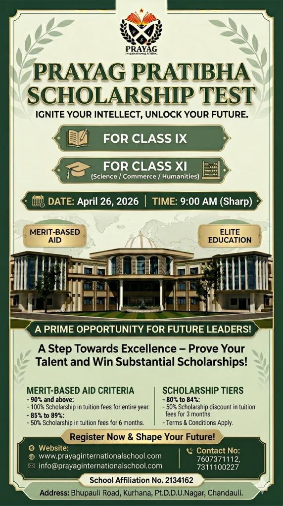 प्रयाग इंटरनेशनल स्कूल में ‘प्रयाग प्रतिभा स्कॉलरशिप टेस्ट’ 26 अप्रैल को, मेधावियों को मिलेगी 100% तक छात्रवृत्ति