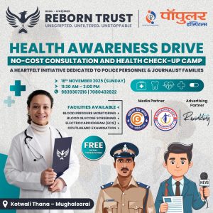 (Reborn Trust – Uttar Pradesh) एवं पॉपुलर हॉस्पिटल वाराणसी के सहयोग से आज पं.दीन दयाल उपाध्याय नगर (मुगलसराय) कोतवाली थाने में पुलिसकर्मियों, पत्रकार बंधुओं एवं जनमानस के लिए “हेल्थ अवेयरनेस ड्राइव” के तहत नि:शुल्क परामर्श एवं स्वास्थ्य जांच शिविर का सफल आयोजन हुआ। कार्यक्रम में सतनाम सिंह – सोशल ऐक्टिविस्ट (संस्थापक एवं अध्यक्ष, रीबॉर्न ट्रस्ट) ने कहा कि “यह शिविर विशेष रूप से सभी पुलिस वालों, पत्रकार बंधुओं के द्वारा की जा रही निस्वार्थ सेवा को समर्पित है। वे हमेशा हमारी सुरक्षा और सेवा के लिए तत्पर रहते हैं, लेकिन हमें भी उनके स्वास्थ्य का ध्यान रखना और उनका ख्याल रखना चाहिए,क्योंकि वो ड्यूटी की जिम्मेदारी निभाते निभाते अपने खुद ख़ुद के स्वास्थ्य का ध्यान कई बार नहीं दे पाते हैं, इसी सोच के तहत आज का शिविर थाना कोतवाली में आयोजित किया गया है। ”उन्होंने यह भी बताया कि रीबॉर्न ट्रस्ट REBORN TRUST का शुभारंभ इस वर्ष स्वतंत्रता दिवस 15 अगस्त को माननीय विधायक श्री रमेश जायसवाल जी द्वारा हुआ था और तीन महीनों में यह चौथा आयोजन है। अगले महीने की 15 दिसम्बर को नगर में रक्तदान शिविर का आयोजन होगा। ट्रस्ट का मुख्य उद्देश्य युवाओं के साथ मिलकर उनको सही दिशा की तरफ ले जाते हुए वर्तमान स्तिथि अनुसार विषय पर समाज सेवा करना है।