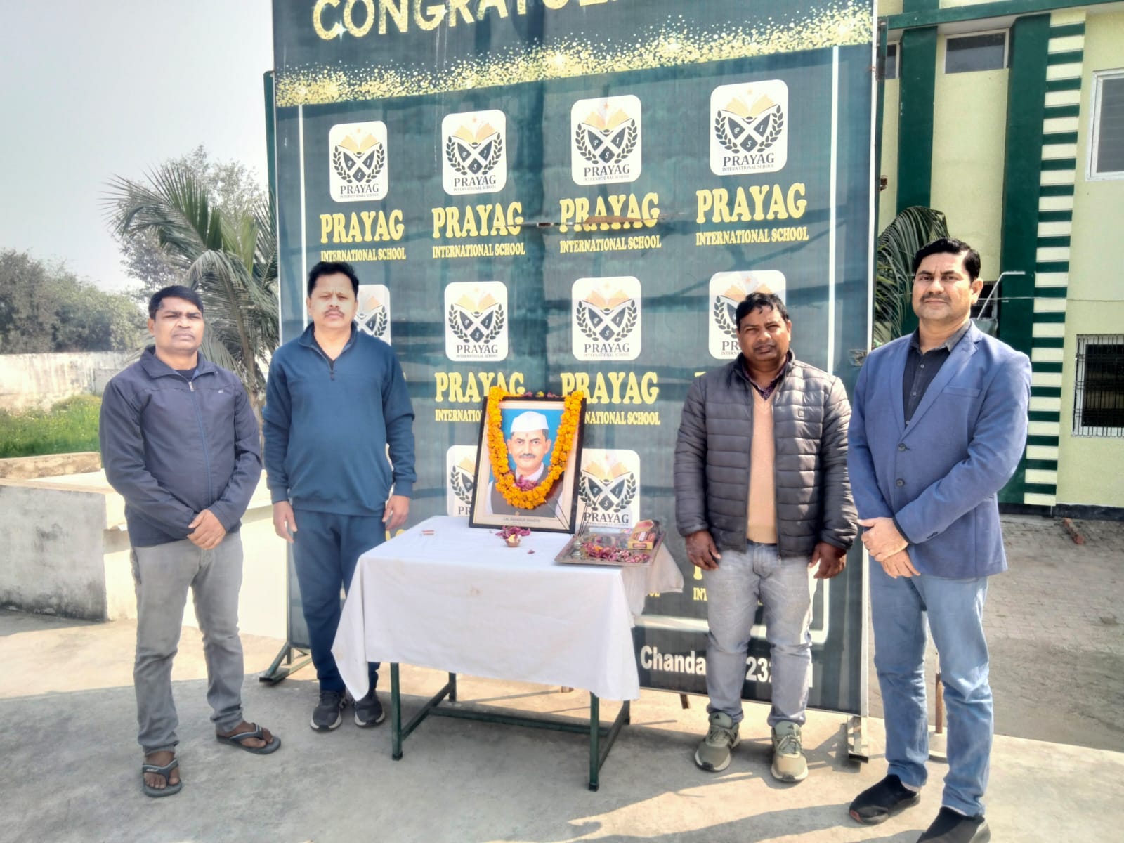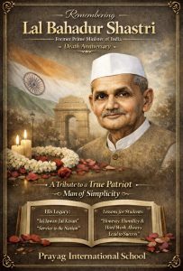 प्रयाग इंटरनेशनल स्कूल में भारत के पूर्व प्रधानमंत्री, भारत रत्न स्वर्गीय लाल बहादुर शास्त्री जी की पुण्यतिथि श्रद्धा और गरिमा के साथ मनाई गई। यह कार्यक्रम राष्ट्रभक्ति, ईमानदारी, नैतिक मूल्यों और सेवा भावनाओं को याद करने के उद्देश्य से आयोजित किया गया।
