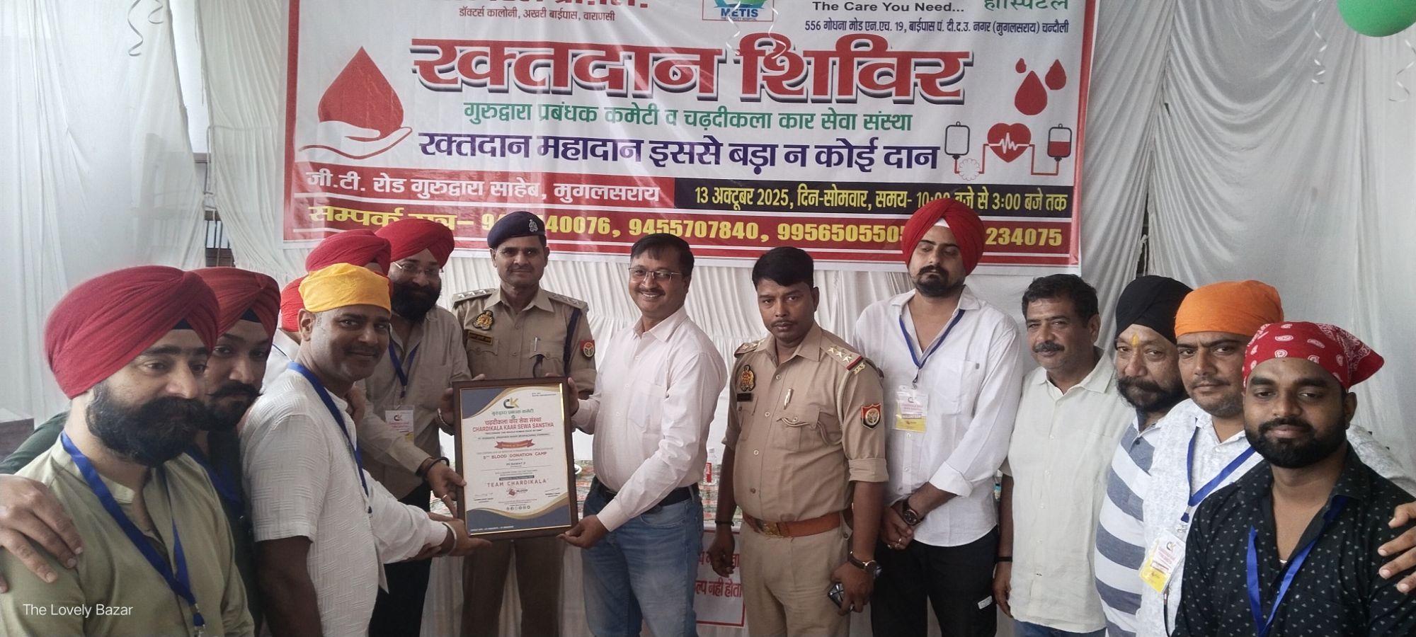 डीडीयू नगर चंदौली । आज दिनांक 13 अक्टूबर 2025 दिन सोमवार को गुरुद्वारा साहिब परिसर जीटी रोड रोड पर गुरुद्वारा प्रबंधक कमेटी एवं चढदी कलाकार सेवा संस्था द्वारा रक्तदान शिविर एवं सम्मान समारोह का आयोजन किया गया। इस दौरान कई लोगों ने रक्तदान कर लोगों की जिंदगियां बचाने का प्रयास किया। उक्त कार्यक्रम में मुख्य अतिथि के रूप में पधारे मुगलसराय के लोकप्रिय विधायक रमेश जायसवाल जी, सीएमओ ऑफिस से पधारे भैया लाल पटेल जी, क्षेत्राधिकारी कृष्ण मुरारी जी, शहर कोतवाल गगन राज सिंह, व आरपीएफ वेस्ट पोस्ट प्रभारी पीके रावत जी मौजूद रहे। साथ ही मेटीज हॉस्पिटल, एवं पूर्वांचल सुपर स्पेशलिटी हॉस्पिटल के कुशल डॉक्टर की टीम द्वारा चिकित्सा शिविर के साथ ही जांच की गई । इस दौरान गुरुद्वारा प्रबंधक कमेटी के पदाधिकारी एवं संरक्षकों तथा चढदीकला कार सेवा संस्था के लोगों द्वारा सभी अतिथियों को स्मृति चिन्ह व अंग वस्त्रम भेंट भेंट किया गया। ब्लड कैंप में 44 महिला पुरुष रक्तदाताओं ने रक्त देकर महादान किया। रक्तदान करने वालों में सभासद आरती यादव सहित समाज की महिलाओं ने भी रक्त देखकर अपना योगदान किया। इस दौरान प्रेस क्लब के अध्यक्ष अमरेंद्र पांडे मौजूद रहे, पिता संस्था के चंद्रभूषण मिश्रा जी रिबॉर्न ट्रस्ट के अध्यक्ष सतनाम सिंह भी मौजूद रहे। गुरुद्वारा प्रबंधक कमेटी के सभी संरक्षक एवं प्रधान रणजीत सिंह, जनरल सेक्रेटरी सरदार महेंद्र सिंह पत्रकार, सुरेंद्र सिंह लवली, रामेंद्र सिंह, गुरदयाल सिंह, रंजीत सिंह, करमजीत सिंह मिंटू, सतपाल सिंह सूरी, गुलशन अरोड़ा, विकी जुनेजा, के साथ ही चढ़दी कलाकार सेवा संस्था के अध्यक्ष केडी सिंह महासचिव मनमीत सिंह राजन सहित संस्था के सभी पदाधिकारी व सदस्य उपस्थित रहे।